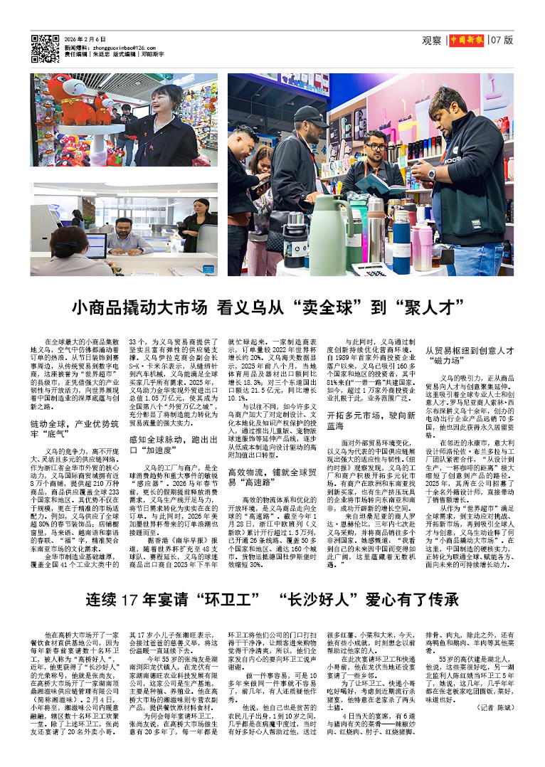 他在高桥大市场开了一家餐饮食材直供基地公司,因为每年新春前宴请数十名环卫工,被人称为“高桥好人“,近年,他更获得了“长沙好人”的光荣称号,他就是张尚友,在高桥大市场开了一家湖南顶鼎湘滋味供应链管理有限公司(简称湘滋味)。2月4日,小年将至,湘滋味公司内暖意融融,辖区数十名环卫工欢聚一堂。除了上述环卫工,张尚友还宴请了20名外卖小哥。其17岁小儿子张湘旺表示,会接过爸爸的慈善义举,将这份温暖一直延续下去。